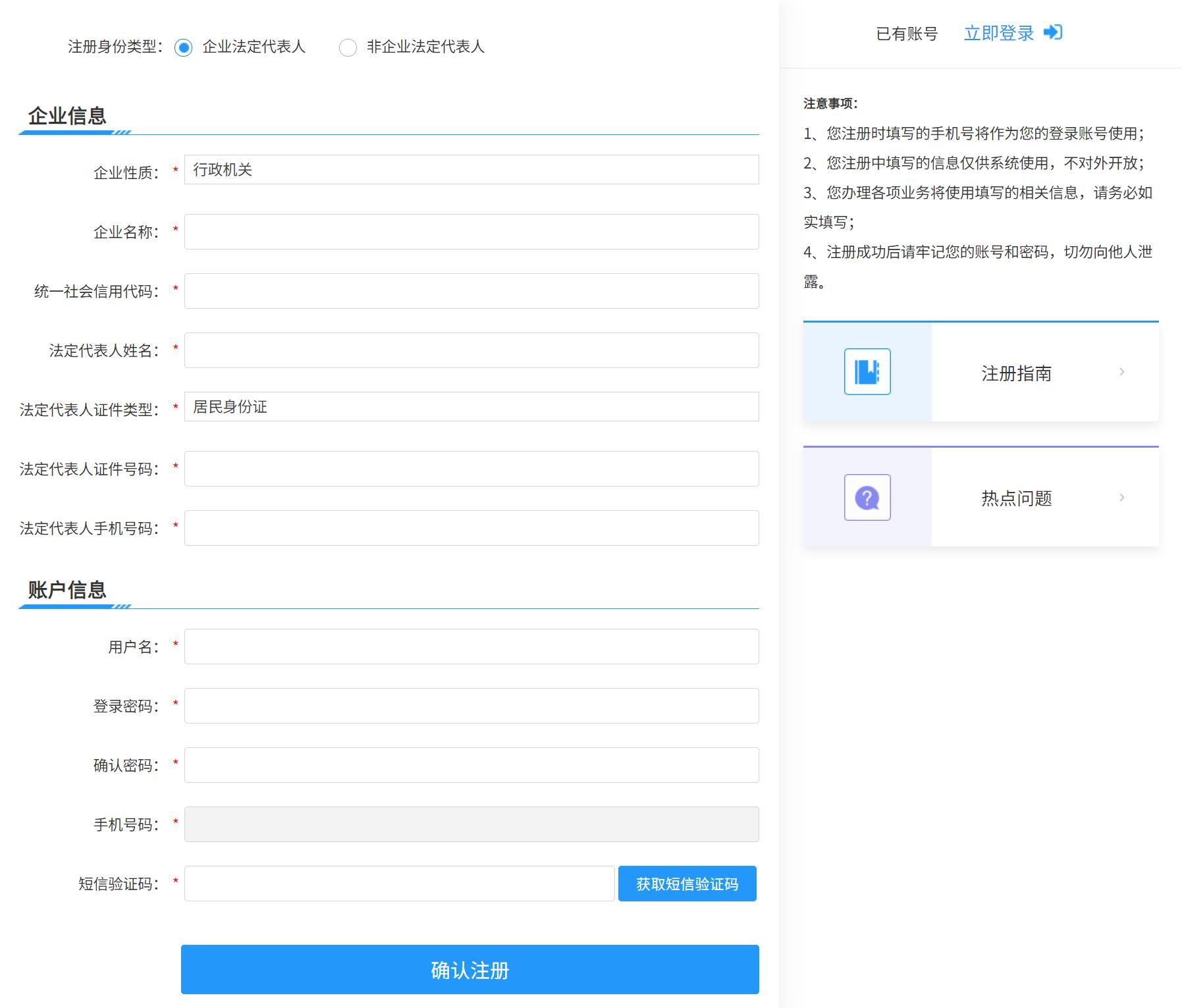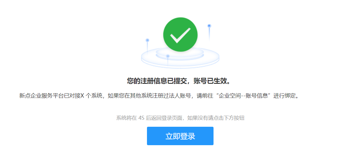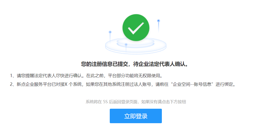 根据相关提示填写企业及经办人信息,点击提交后完成注册。注册信息提交之后,法定代表人会收到消息提醒。法定代表人确认完成之后,才能办理该企业相关业务。