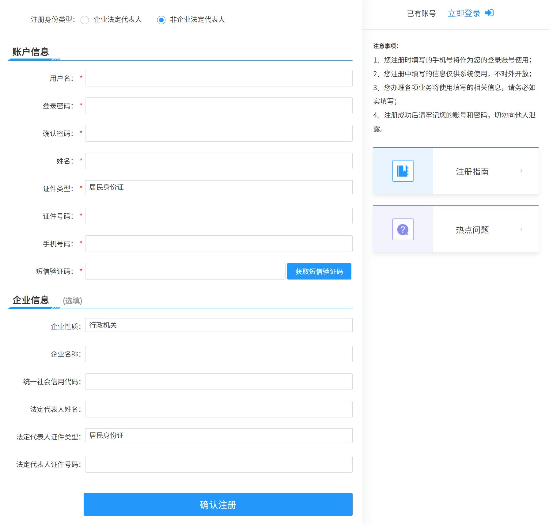 根据相关提示填写企业信息,企业信息必须是系统中已经存在并且正确的企业信息,点击提交后完成注册。